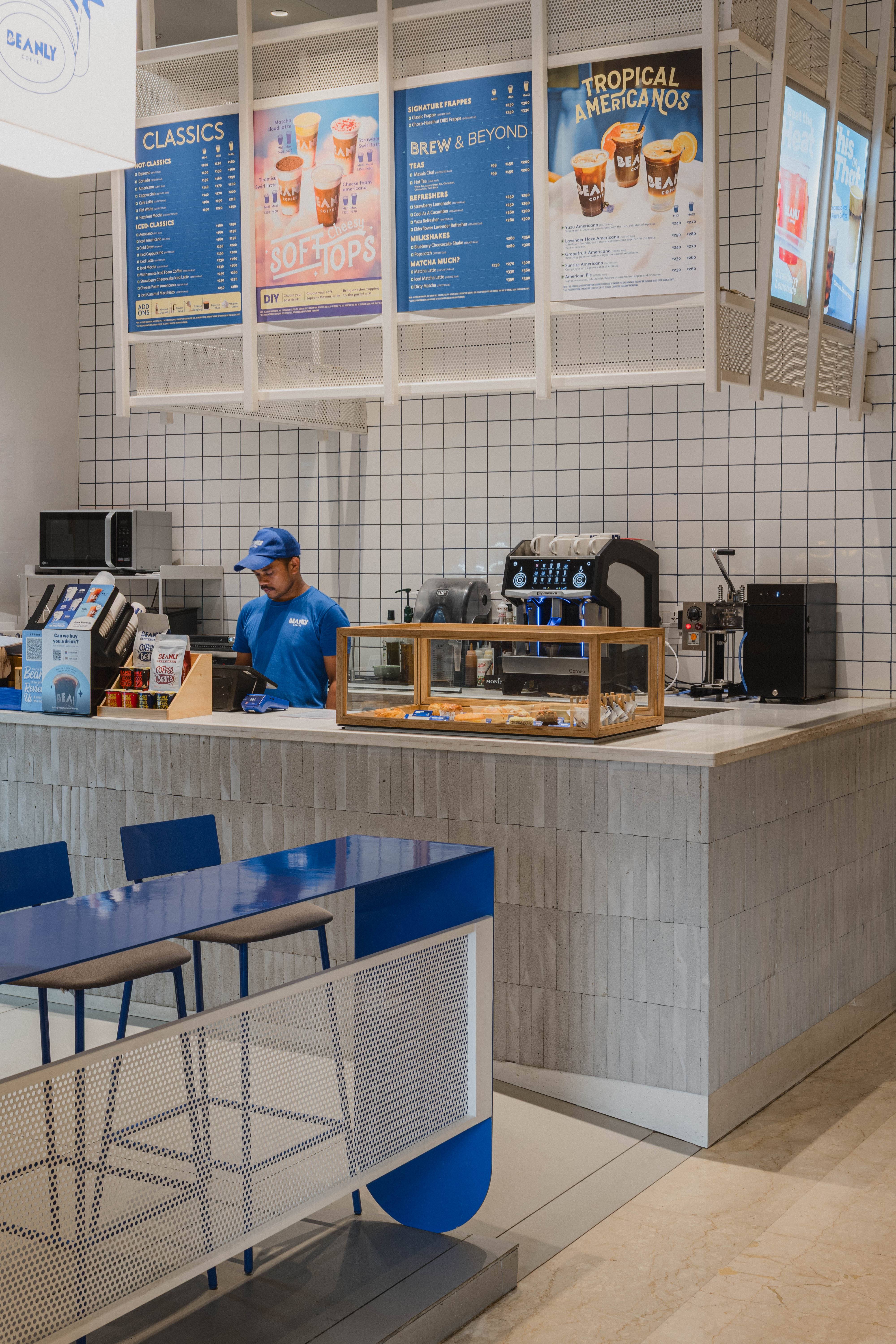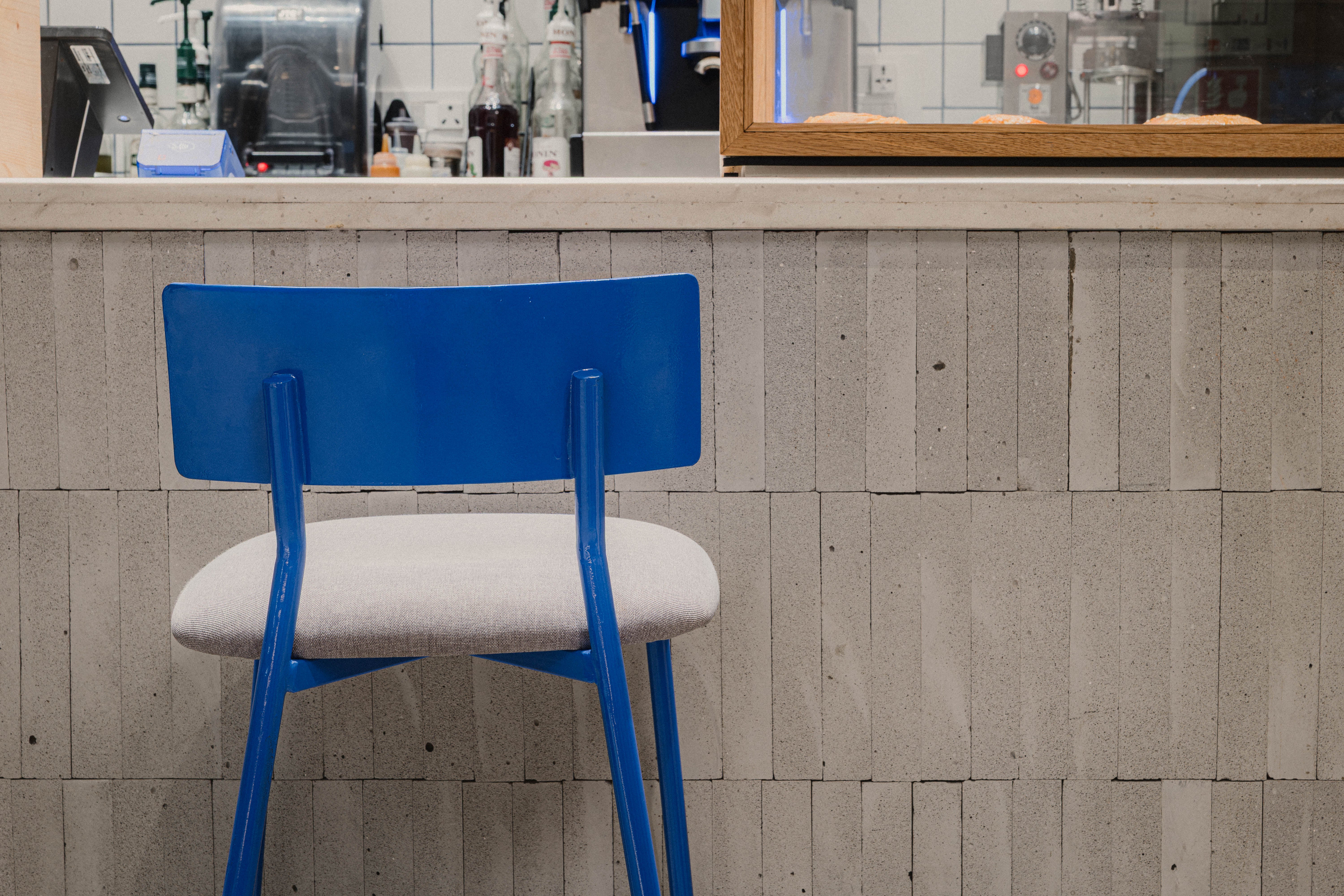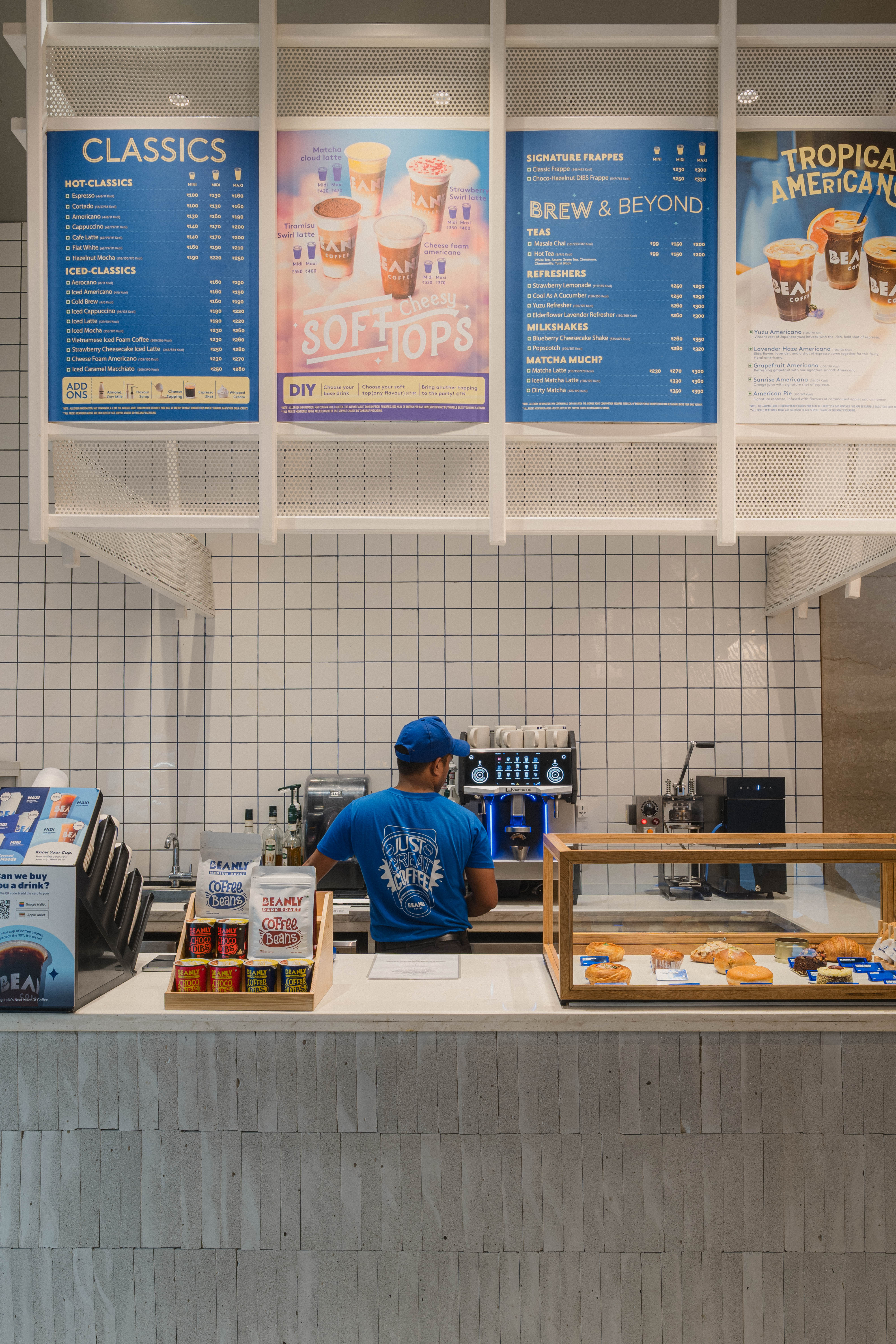 Beanly’s brand ethos extends beyond coffee, so we designed a dedicated wall to showcase their merchandise — a thoughtful nod to the products that define their identity. The interplay of warm wood and sleek metal introduces texture and rhythm, tying together the café’s material palette. For the counter front, we wanted to create something that felt both tactile and durable, so we designed custom tiles using cement blocks — a raw, honest detail that complements the café’s overall mood.
