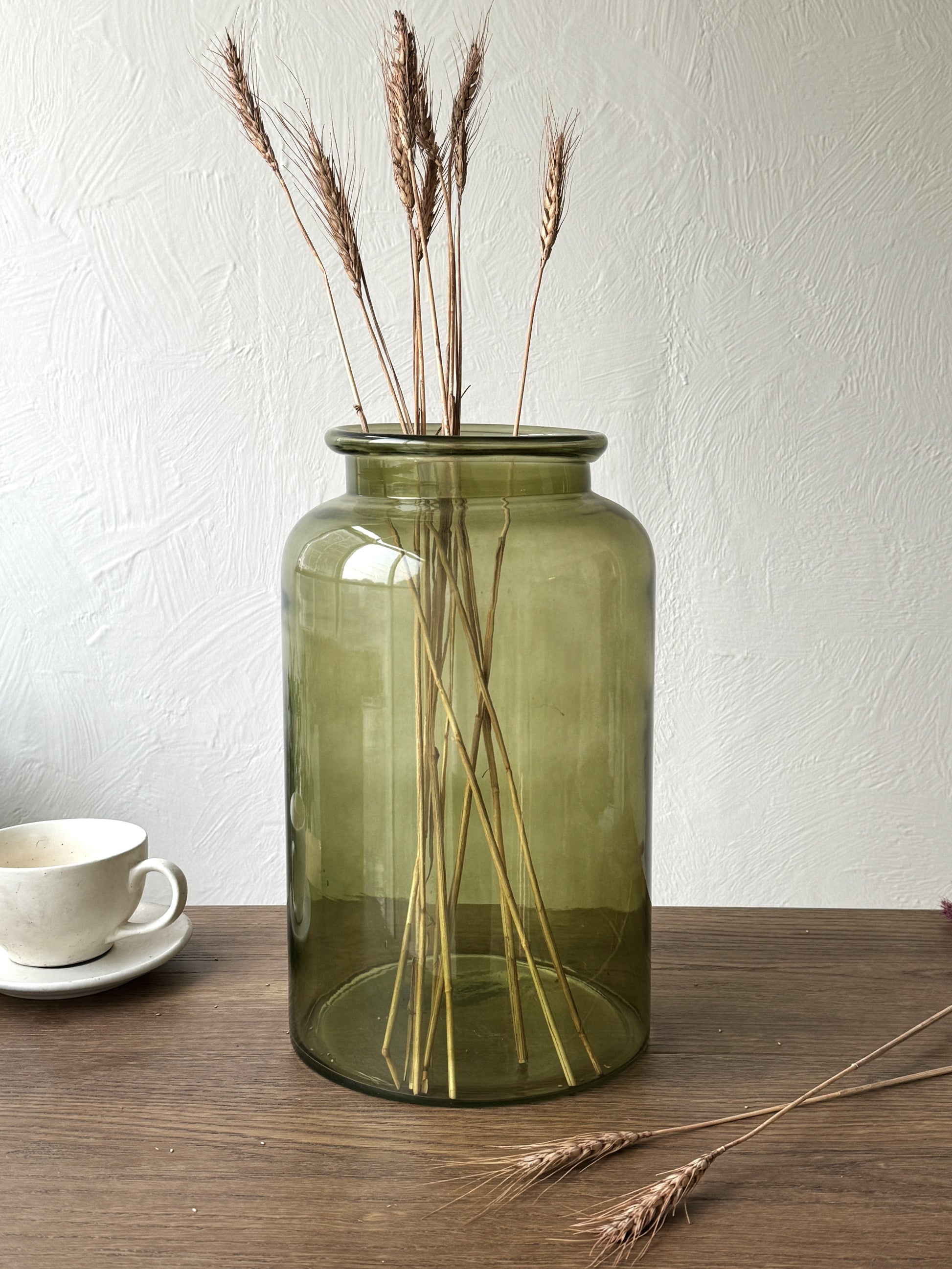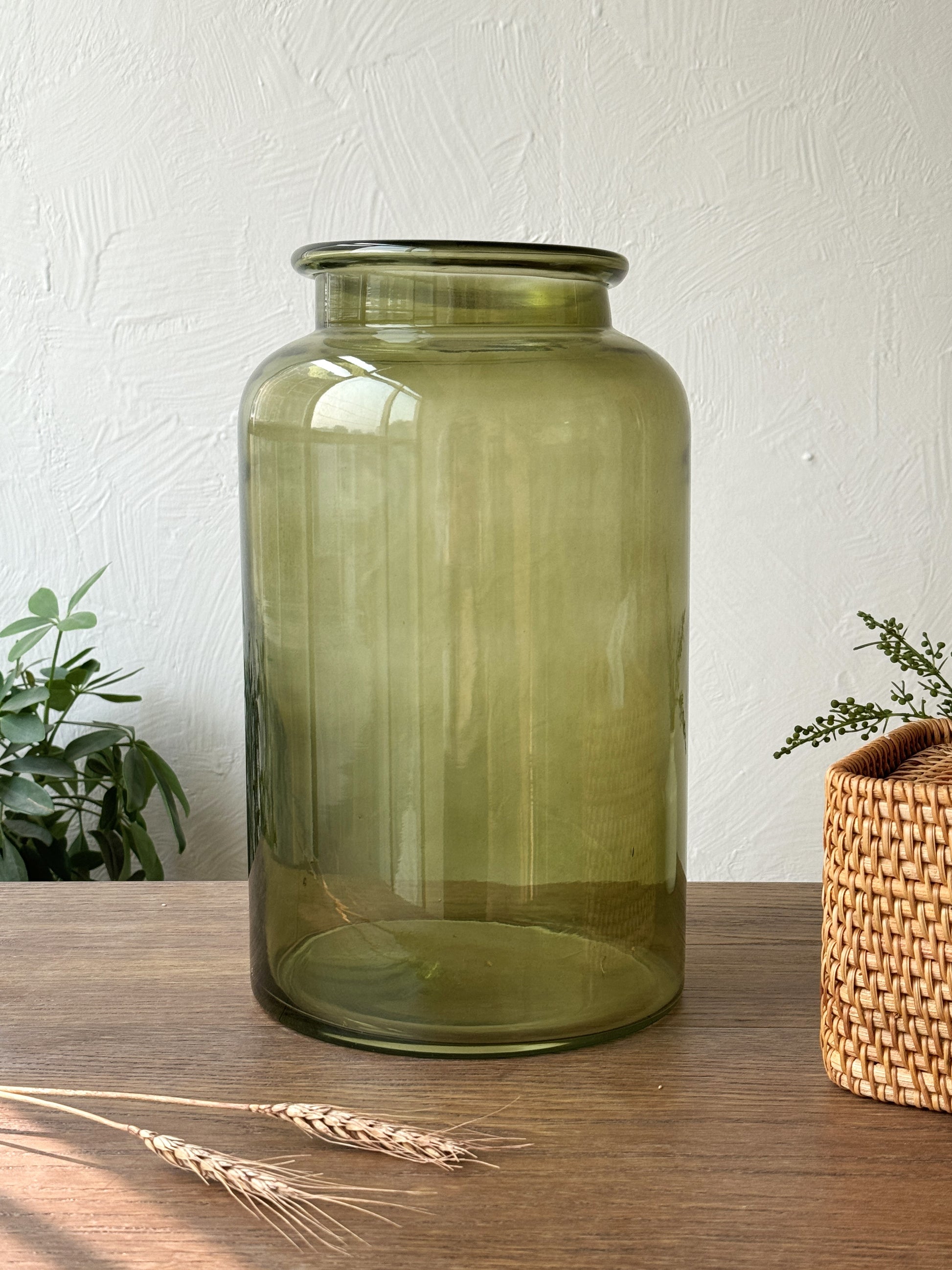 This handblown Oilve Jar vase features a cylindrical silhouette with a wide collar rim—perfect for tall branches or oversized stems. Its soft, muted hue and clean lines make it a striking accent for corners, consoles, or entryways.